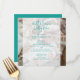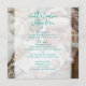 Plantilla de menú boda de cascos en papel cuadrado. Creado para una recepción sencilla con dos plantillas de texto. Agregue un título que incluya los nombres de la pareja. Todos los elementos del menú se enumeran en un párrafo utilizando espacios para separar secciones para aperitivos, entrantes y postres, o su elección. La letra es casual escrita a mano en marrón oscuro. La fotografía de conchas marinas es la imagen de fondo y es la misma en la parte trasera.