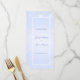 Estos menús de boda personalizados presentan un fondo azul pálido con sombra, borde blanco y delicados copos de nieve.