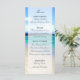 Plantilla de menú Boda de 2 lados para bodas de playa. En el primer lado se pueden encontrar aperitivos, ensaladas, plato principal y postre frente a un océano azul y dramático con playa de arena. Nubes blancas y esponjosas en el fondo con una hermosa sombra de cielo azul. En la parte trasera hay la misma hermosa foto de una playa perfecta. Se puede personalizar de la forma que desee con los campos, la selección de fuentes y el color de la fuente. Perfecto para la recepción nupcial o cualquier otro evento especial en el destino de la playa de novios.