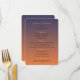 Este menú del atardecer crea un agradable ambiente cálido por la noche y es perfecto para su recepción o fiesta por la noche. Cuenta con un bonito naranja y una obra de arte azul con estrellas pequeñas. También hay plantillas para cuatro entrantes, cuatro platos principales, cuatro postres y varias bebidas para elegir el menú. Estas son claramente de fácil lectura.