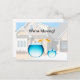 Funny plantilla de postales de invitación en movimiento en un diseño humorístico con imágenes de peces saltando de una casa a otra e imagen de una casa residencial en el fondo que puedes usar como se muestra o borrar el gráfico de la casa con y desde la plantilla en el lado de escritura que puedes usar para personalizar tu invitación o quitarlas y escribir a mano tu propia.