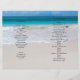 Programa de boda de playa plegado con texto en cuatro páginas. El papel mide 21,59 por 27,94 cm y una escena de playa está impresa en ambos lados. Estrellas de mar blancas, o estrellas de mar, decoran la parte delantera y trasera. Las plantillas de texto crean una portada, dos páginas interiores y una contraportada. Texto negro se imprime sobre arena de playa y agua azul tropical. Este artículo tiene selecciones de papel.
