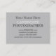 Las plantillas de tarjetas de visita de fotografía son tarjetas de visita de doble cara y color para fotógrafos. Crea tarjetas de visita personalizado agregando tu propia información profesional de fotografía y fotógrafos. Una vez que hayas hecho la personalización, puedes pedir las tarjetas de visita en línea. Haz que tus propias tarjetas de visita sean más fáciles con estas plantillas de tarjetas de visita únicas.