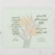 Plantilla de programa de bodas dobladas con flores naranjas de pájaro del paraíso. Papel verde pálido con cuatro páginas para personalizar en escritura y texto verde oscuro impreso. Incluya un mensaje a la familia y amigos en la última página / parte posterior del programa cuando esté plegado.