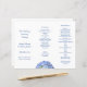 Programa de boda triple pliegue en blanco con texto azul y diseño de flor hidrangea azul. Después de la compra, se convierten en tercios para crear tres páginas con título, nombre, fecha y ubicación del servicio en la parte delantera. La parte central contiene la información de la ceremonia con el lado derecho para listar la fiesta de boda, una nota personal a los invitados, en memoria de, o lo que quieras. Una imagen de hidrangea azul claro está en la parte inferior de la sección central.