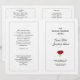 Rosas rojas en el programa de bodas dobladas en blanco y negro. Diseño sencillo con cuatro páginas a personalizar con mucho texto, hecho para una larga ceremonia católica. Las escrituras cristianas o un verso favorito se pueden agregar a la página de atrás junto con un mensaje de agradecimiento.