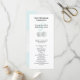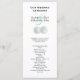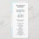 Programa de bodas en dólares de arena. Tarjetas altas con ceremonia en la parte delantera y la lista de fiestas de boda en la parte trasera. Blanco con texto negro y dos dólares de arena blanca para representar a la novia y al novio. El azul acuático "&" (ampersand) coincide con el fondo azul claro del reverso.