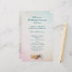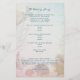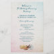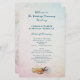 Programa de bodas en mares vivos impreso en papel asequible. Texto personalizar en ambos lados sobre un fondo degradado con conchas en la parte delantera y más vida marina en la parte posterior. El texto es de color azul marino y alterna entre el guión y los tipos de letra impresos. En la parte de atrás se da espacio para un breve mensaje de la pareja. El papel tiene un tamaño de 5,5 x 8,5.