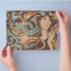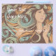 Plantilla de volante de salón con la cara de una mujer hermosa y el pelo largo y rizado