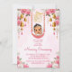 Ceremonia hindú tradicional de Nombramiento de Bebé Ceremonia de cuna plantilla editable invitación a descarga digital instantánea, invitación a la ceremonia de Namakarana, flores rosas y campanas adornadas cuna con un lindo bebé y flores rosas y blancas guirnaldas con decoración de campanas doradas alrededor con oro Ganesha, para una niña, colores pastel rosa y blanco, se puede usar para primera ceremonia de arroz Anparashant