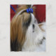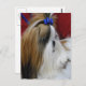 Perro shih-tzu blanco y marrón con un arco en su piel.