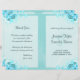© Diseños de Sunny Mars - Flor Hibiscus Floral: Tarjetas Planas de Programa de Boda Bi Plegables de Azul Acuático Claro - Plantilla de programa de boda personalizable moderna y elegante con una ilustración de una decoración floral de hibisco azul acuático giratorio y elegante contra un fondo verde teñido.