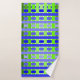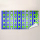 Este conjunto de toallas está recubierto de una manta azul-verde sobre un campo blanco.