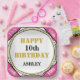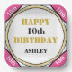 Feliz Cumpleaños está escrito con tipografía de esténcil en color oro. Para el chica de 10 años o personalizar para cualquier edad. Escriba la edad y el nombre en texto negro con fondo blanco. Cuatro esquinas son de color rosa bonito con la edad escrita en blanco. Haga clic en Personalizar para cambiar el fondo de las esquinas rosadas triangulares a través de Color de relleno, o para aumentar o disminuir el tamaño del tipo de letra Nombre. XO está en texto dorado en patrón circular. Diseño original © TamiraZDesigns.
