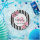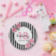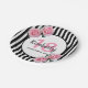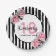 Un plato de papel para una fiesta de cumpleaños 18. Rayas verticales clásicas delgadas en blanco y negro como fondo. Con rosas rosas rosa femeninas y femeninas como decoración. Un marco blanco y rosa en la parte delantera con una plantilla para la edad, el nombre y la fecha. Número de edad en rosa, nombre y fecha en negro. El nombre está escrito con un guión de estilo con letras a mano.
