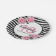 Un plato de papel para una fiesta de cumpleaños 18. Bandas horizontales clásicas delgadas en blanco y negro como fondo. Con rosas rosas rosa femeninas y femeninas como decoración. Un marco blanco y rosa en la parte delantera con una plantilla para la edad, el nombre y la fecha. Número de edad en rosa, nombre y fecha en negro. El nombre está escrito con un guión de estilo con letras a mano.