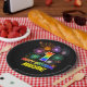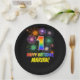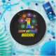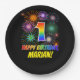Este alegre, colorido y divertido diseño de placa de papel con temática de cumpleaños presenta un gran número "1" y el mensaje "FELIZ CUMPLEAÑOS", ambos coloreados con un patrón inspirado en el gradiente del espectro del arcoiris, junto con un nombre personalizado amarillo en negrita. También cuenta con un emocionante y vibrante patrón inspirado en fuegos artificiales de celebración. Tiene un fondo de color negro. Placas de papel divertidas y personalizadas como esta pueden ser usadas en una fiesta de cumpleaños que se celebra para celebrar el primer cumpleaños de alguien. [~Z0000489]