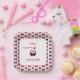 Un plato de cumpleaños para un año. Todos los elementos de texto se pueden personalizar: Nombre, título, saludo. El diseño incluye un panda sonriente con un globo rojo que tiene la figura 1. Un nuevo patrón de pandas sobre un fondo rosa pálido decora el borde del plato.