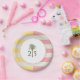 Party plates to celebrate a 25th birthday with tropical elegance — think sunshine, palm trees, and a touch of modern preppy charm. This custom birthday party plate coordinates with a matching invitation and other party supplies. Featuring soft pastel stripes in blush pink, butter yellow, and cream with a minimalist palm tree motif in the center bordered on each side with the guest of honor's age, this design blends casual luxury with sunny tropical charm. You can personalize for any age. Plates are available in 2 sizes: shown here in the smaller 7-inch diameter size; also available in 9-inch diameter size.