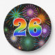 Este alegre, colorido y divertido diseño de placas de papel presenta un gran número "26" con un colorante inspirado en el gradiente del espectro arcoiris. También cuenta con un vibrante y excitante estallido de fuegos artificiales de celebración inspirados. El fondo es negro de color. Placas de papel divertidas como esta podrían ser usadas en un fiesta que se celebra para celebrar el 26 aniversario de alguien, el 26 aniversario o algún otro 26 aniversario. [~Z0000490]