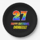 Este colorido, divertido y alegre diseño de placa de papel con temática de cumpleaños presenta un gran número "27" y el mensaje "FELIZ CUMPLEAÑOS", ambos coloreados con un patrón inspirado en el gradiente del espectro del arcoiris, junto con un nombre editable en negrita amarillo. El fondo es negro de color. Placas de papel divertidas y editables como esta pueden ser usadas en una celebración que se lleva a cabo para honrar el cumpleaños 27 de alguien. [~Z0000488]