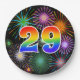 Este alegre, colorido y divertido diseño de placas de papel presenta un gran número de colores "29" con un diseño inspirado en el gradiente del espectro arcoiris. También cuenta con un emocionante y vibrante patrón inspirado en fuegos artificiales de celebración. Tiene un fondo de color negro. Placas de papel divertidas como esta podrían ser usadas en un fiesta que se celebra para celebrar el 29º cumpleaños de alguien, el 29º aniversario o algún otro evento del 29º. [~Z0000490]