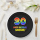 Este alegre, divertido y colorido diseño de placa de papel con temática de cumpleaños presenta un gran número "30" y el mensaje "FELIZ CUMPLEAÑOS", ambos coloreados con un patrón inspirado en el gradiente del espectro del arcoiris, junto con un nombre en negrita de personalizable amarillo. El fondo es negro de color. Diversión, placas de papel de personalizable como esta podrían ser usadas en un fiesta que se celebra el trigésimo cumpleaños de alguien. [~Z0000488]