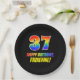 Este divertido, alegre y colorido diseño de placa de papel con temática de cumpleaños incluye un gran número "37" y el mensaje "FELIZ CUMPLEAÑOS", ambos con un coloreado de patrones inspirado en el gradiente del espectro del arcoiris, junto con un nombre personalizado amarillo en negrita. El fondo es negro de color. Platos de papel divertidos y editables como este podrían ser usados en una fiesta de cumpleaños que se lleva a cabo para celebrar el cumpleaños treinta y siete de alguien. [~Z0000488]