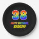 Este colorido, alegre y divertido diseño de placa de papel con temática de cumpleaños presenta un gran número "38" y el mensaje "FELIZ CUMPLEAÑOS", ambos coloreados con un patrón inspirado en el gradiente del espectro del arcoiris, junto con un nombre personalizado amarillo en negrita. El fondo es negro de color. Diversión, placas de papel con temas de cumpleaños de personalizable como esta podrían ser usadas en la fiesta de cumpleaños treinta y ocho de alguien. [~Z0000488]