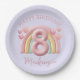 A custom birthday party plate for an 8 year old girl featuring cute rainbow theme on a soft purple background. An image of a 3D balloon style, pastel pink number "8" is placed over a cute chubby and shiny rainbow. Cute little hearts accent the area. A sample "HAPPY BIRTHDAY" greeting is printed above, with a sample name printed below. You can personalize the plate to include your own custom name or other text.