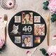 Un plato de papel para una fiesta de 40 años para una joven que celebra su vida con un collage de 8 de sus propias fotos. Plantillas la edad de 40 años y una fecha. Fecha de nacimiento o fecha del fiesta. Letras de color blanco y gris. Fondo negro.