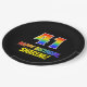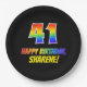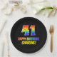 Este alegre, divertido y colorido diseño de placa de papel con temática de cumpleaños incluye un gran número "41" y el mensaje "FELIZ CUMPLEAÑOS", ambos con un coloreado de patrones inspirado en el gradiente del espectro del arcoiris, junto con un nombre personalizado amarillo en negrita. El fondo es negro de color. Placas de papel con temas de cumpleaños como esta pueden ser divertidas de usar en un fiesta que se celebra el 41 cumpleaños de alguien. [~Z0000488]
