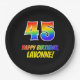 Este divertido, alegre y colorido diseño de placas de papel de cumpleaños incluye un gran número "45" y el mensaje "FELIZ CUMPLEAÑOS", ambos con un colorante inspirado en el gradiente del espectro del arcoiris, junto con un nombre personalizado amarillo en negrita. Tiene un fondo de color negro. Diversas placas de papel con temática de cumpleaños personalizadas como esta podrían ser usadas en la fiesta de cumpleaños número 45 de alguien. [~Z0000488]