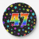 Este alegre, divertido y colorido diseño de placas de papel cuenta con un gran número "47" que contiene un colorante inspirado en el gradiente del espectro arcoiris. El fondo presenta un colorido patrón de estrellas. Placas de papel divertidas como esta podrían ser usadas en la celebración de cuarenta y siete años de alguien, o en un fiesta del 47 aniversario de una pareja, o en otro evento del 47. [~Z0000493]