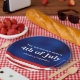 Estos platos fiestas personalizados presentan una temática elegante y patriótica del 4 de julio sobre un fondo de color azul marino oscuro, de estilo Relieve metalizado metálico. En la parte de abajo hay una pancarta de rayas rojas y blancas que representa la bandera estadounidense. El título fiesta del "4 de julio" se imprime en el centro con una gran fuente blanca, seguida de la información del evento.