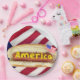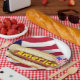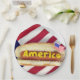Invitación patriótica con perrito caliente en placa de bandera para el Fiesta del 4 de julio.