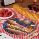 Un ambiente festivo incluye un perrito caliente en un plato patriótico, con la palabra "AMÉRICA" escrita en mostaza
