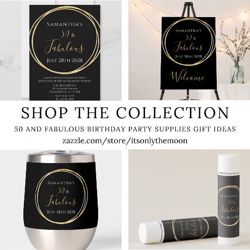 Esta es una moda y elegante diseño de fiesta de cumpleaños número 50. Este elegante diseño está decorado en negro y oro clásico. Tiene el texto "Samantha's 50 and Fabulous" y la fecha de la celebración. Este sencillo y moderno motivo tipográfico está enmarcado por un elegante círculo dorado. Este elegante diseño es perfecto para una moda e inolvidable celebración de fiestas de 50 años. Para personalizar, simplemente agregue su nombre y fecha en el cuadro de texto personalizar. Para cambiar el color o el tipo de letra, desproteja la herramienta de edición de diseño. Si necesita ayuda con la personalización, productos coincidentes o para un diseño personalizado, póngase en contacto conmigo a través de zazzle chat o correo electrónico: ursuladawnmoon@gmail.com