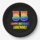 Este colorido, alegre y divertido diseño de placa de papel con temática de cumpleaños cuenta con un gran número "55" y el mensaje "FELIZ CUMPLEAÑOS", ambos con un coloreado de patrones inspirado en el gradiente del espectro del arcoiris, junto con un nombre personalizado amarillo en negrita. Tiene un fondo de color negro. Placas de papel con temas de cumpleaños como esta pueden ser divertidas de usar en un fiesta que se celebra para celebrar los cincuenta y cinco años de alguien. [~Z0000488]