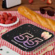 Globos fiestas y confeti sobre fondo negro con el neón número 55 para una fiesta de cumpleaños número 55. El texto "Años asombrosos" puede ser editado o borrado.