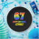 Este alegre, colorido y divertido diseño de placa de papel con temática de cumpleaños presenta un gran número "67" y el mensaje "FELIZ CUMPLEAÑOS", ambos con un colorante inspirado en el gradiente del espectro del arcoiris, junto con un nombre personalizado amarillo en negrita. Tiene un fondo de color negro. Placas de papel divertidas y personalizadas como esta pueden ser usadas en una celebración de cumpleaños que se lleva a cabo en honor del cumpleaños 67 de alguien. [~Z0000488]