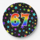 Este divertido, colorido y alegre diseño de placas de papel presenta un gran número "67" que contiene un colorante inspirado en el gradiente del espectro arcoiris. El fondo presenta un colorido patrón de estrellas. Las placas de papel divertidas como esta pueden ser usadas en la celebración de los 67 años de alguien, o en el fiesta del 67 aniversario de un boda de una pareja, o en algún otro evento del sesenta y siete. [~Z0000493]