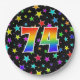 Este divertido, alegre y colorido diseño de placas de papel presenta un gran número de colores "74" con un diseño inspirado en el gradiente del espectro arcoiris. El fondo presenta un patrón multicolor de formas estelares. Placas de papel divertidas como esta pueden ser usadas en una celebración que se lleva a cabo en honor del 74 cumpleaños de alguien, o el setenta y cuarto aniversario de una pareja, o algún otro evento del 74. [~Z0000493]