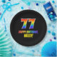 Este alegre, colorido y divertido diseño de placa de papel con temática de cumpleaños presenta un gran número "77" y el mensaje "FELIZ CUMPLEAÑOS", ambos con un colorante inspirado en el gradiente del espectro del arcoiris, junto con un nombre personalizado amarillo en negrita. El fondo es negro de color. Diversas placas de papel con temática de cumpleaños personalizadas como esta podrían ser usadas en la fiesta de cumpleaños número 77 de alguien. [~Z0000488]