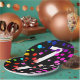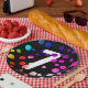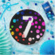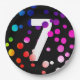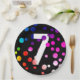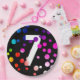 Patrón neon rainbow dot sobre fondo negro para la fiesta de cumpleaños 7. La edad puede ser editada. Se puede cambiar el color de fondo negro.