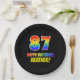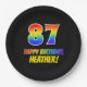 Este colorido, divertido y alegre diseño de placa de papel con temática de cumpleaños presenta un gran número "87" y el mensaje "FELIZ CUMPLEAÑOS", ambos coloreados con un patrón inspirado en el gradiente del espectro del arcoiris, junto con un nombre en negrita de personalizable amarillo. El fondo es negro de color. Las placas de papel con temática de cumpleaños como esta podrían ser usadas para celebrar el cumpleaños 87 de alguien. [~Z0000488]