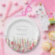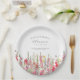 La decoración de la mesa es perfecta para una fiesta de cumpleaños en agosto. El gladiolo rosado es la flor de nacimiento de ese mes. Forma un borde inferior de acuarela de bonito en este plato floral personalizado. El invitado de cumpleaños del honor, su nombre, edad y fecha de nacimiento se colocan encima de él usando una caligrafía y tipografía elegantes. Todo el texto es editable.