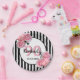 Un plato de papel para una fiesta de cumpleaños número 90. Rayas verticales clásicas delgadas en blanco y negro como fondo. Con flores rosadas femeninas y femeninas, rosas y peonías como decoración. Un marco blanco y rosa en la parte delantera con plantilla para los 90 años, nombre y fecha. Número de edad en rosa, nombre y fecha en negro. El nombre se escribe con un guión de estilo con letras a mano.