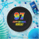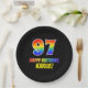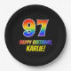 Este alegre, colorido y divertido diseño de placas de papel de cumpleaños presenta un gran número "97" y el mensaje "FELIZ CUMPLEAÑOS", ambos coloreados con un patrón inspirado en el gradiente del espectro del arcoiris, junto con un nombre personalizado amarillo en negrita. El fondo es negro de color. Las placas de papel con temática de cumpleaños como esta podrían ser usadas en un fiesta que celebra el cumpleaños noventa y siete de alguien. [~Z0000488]