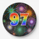 Este divertido, colorido y alegre diseño de placas de papel presenta un gran número de colores "97" con un diseño inspirado en el gradiente del espectro del arco iris. También cuenta con un emocionante y vibrante patrón inspirado en fuegos artificiales de celebración. El fondo es negro de color. Placas de papel como esta pueden ser divertidas de usar en una celebración que se lleva a cabo para honrar a alguien que está celebrando su noventa y siete cumpleaños, un noventa y siete años, o algún otro evento del 97. [~Z0000490]